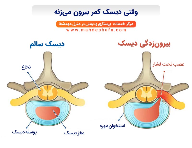 وقتی دیسک بین مهره‌ها پاره می‌شه، قسمت نرم داخلش بیرون می‌زنه و به عصب فشار میاره.