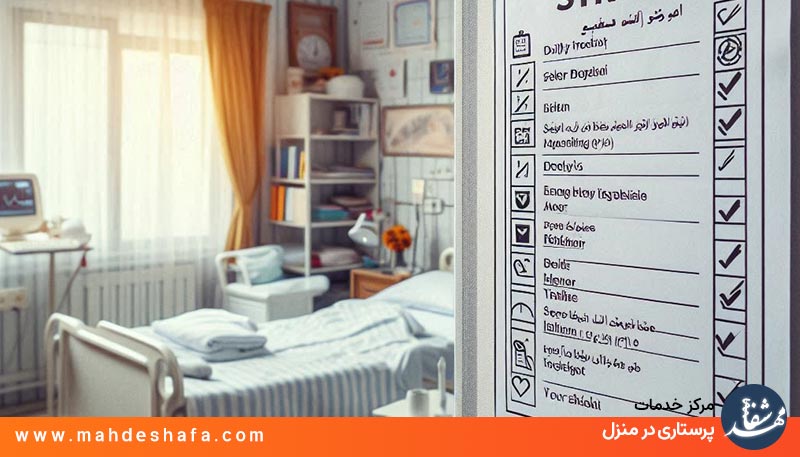 برای اینکه چیزی از قلم نیفته و با خیال راحت از بیمار مراقبت کنی، داشتن یه چک‌لیست روزانه می‌تونه خیلی کمک‌کننده باشه. این چک‌لیست باعث می‌شه بدون سردرگمی بدونی هر روز چی‌کار باید انجام بشه: