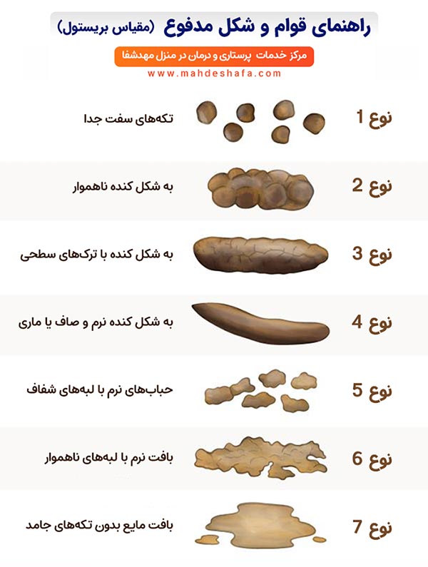 نوع ۵ | حبابهای نرم با لبههای شفاف عبور سریعتر مواد از روده؛ گاهی طبیعی و گاهی نشانهٔ تحرک بالاتر روده. | مطمئن شوید مایعات کافی مصرف میشود؛ در صورت تکرار یا تغییر رنگ/بو، بررسی پزشکی مدنظر باشد. |