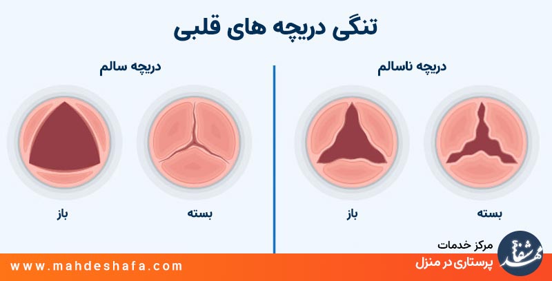 تنگی مثل اینه که درِ یک اتاق خوب باز نشه و راه خروج تنگ بشه. در نتیجه خون باید با زور بیشتری از اون دریچه عبور کنه، و این به قلب فشار اضافه وارد میکنه.