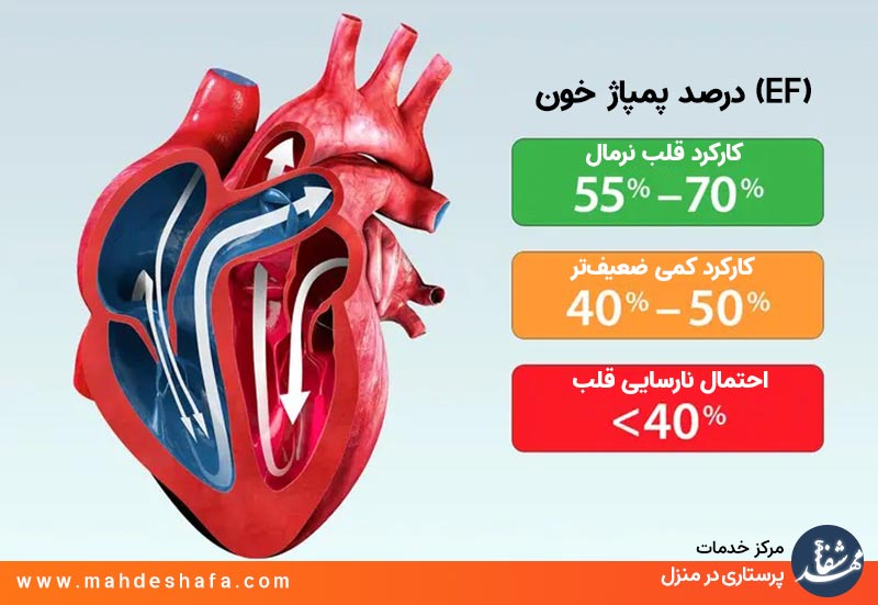 قلب مثل یک پمپ عمل میکنه. هر بار که منقبض میشه، باید بخشی از خون داخلش رو به بدن بفرسته. EF اندازهگیری میکنه که از کل خون داخل قلب، چند درصدش با هر ضربه پمپاژ میشه.